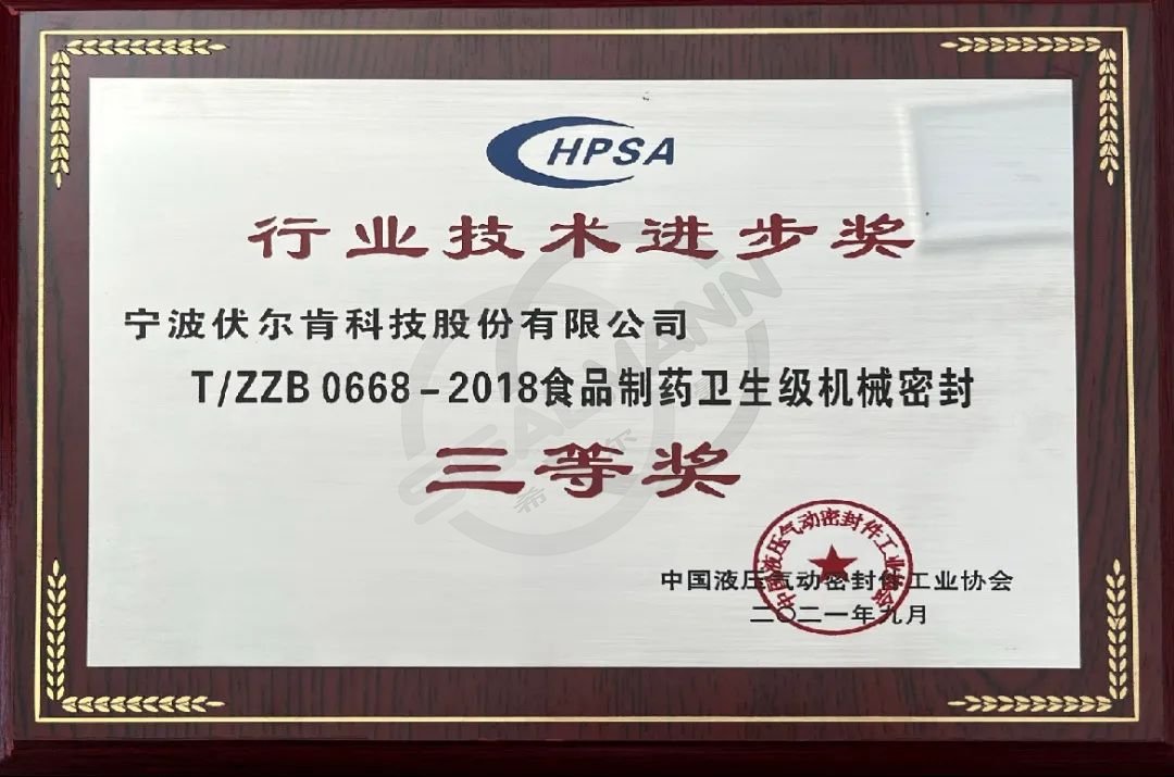 我司《T/ZZB0668-2018食品制药卫生级机械密封》项目也同时荣获行业技术进步三等奖,此项目的成功代表了我司在机械密封行业的进步。